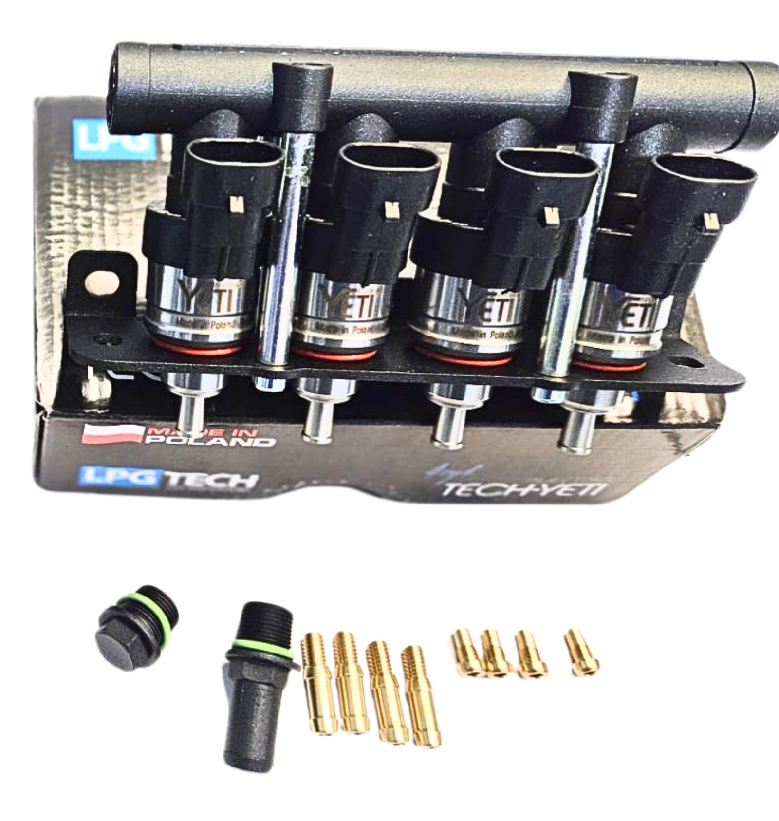 Riel de inyección con inyectores Yeti – 4 cilindros, tomas de inyectores tipo Valtek, dos conectores de entrada de gas atornillados con un diámetro exterior de 12,1 milímetros y juntas tóricas de estanqueidad, una tapa de extremo atornillada del cuerpo del riel con junta tórica de estanqueidad, cuatro boquillas de calibración de latón (18.LPG.908), cuatro boquillas para el colector de admisión con un diámetro exterior de 6 milímetros (18.NAG.121).